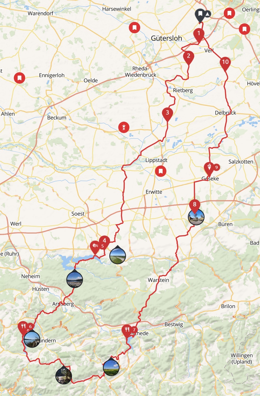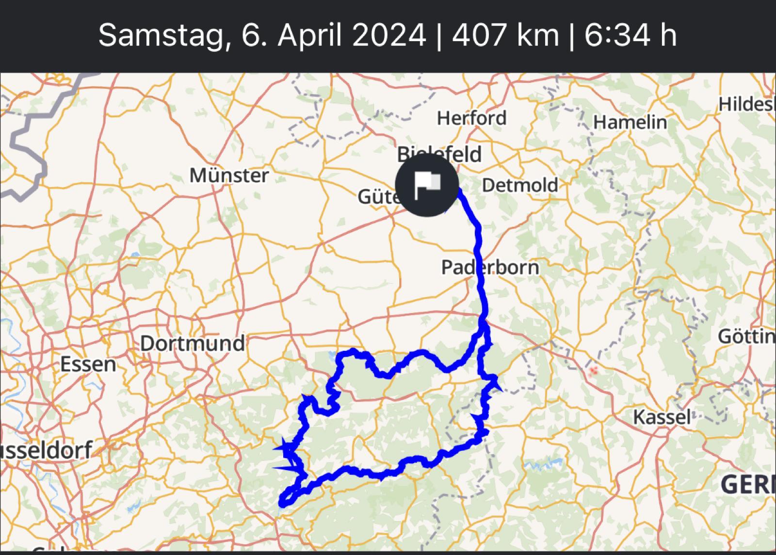 Die Große Sauerland Seentour. Gute 400 Kilometer von Bielefeld über die Aabachtalsperre und den Diemelsee zum Biggesee. Von dort über den Sorpesee und den Möhnesee wieder zurück nach Biefeld. Das Wetter war super und alle sind heile Zuhause angekommen.