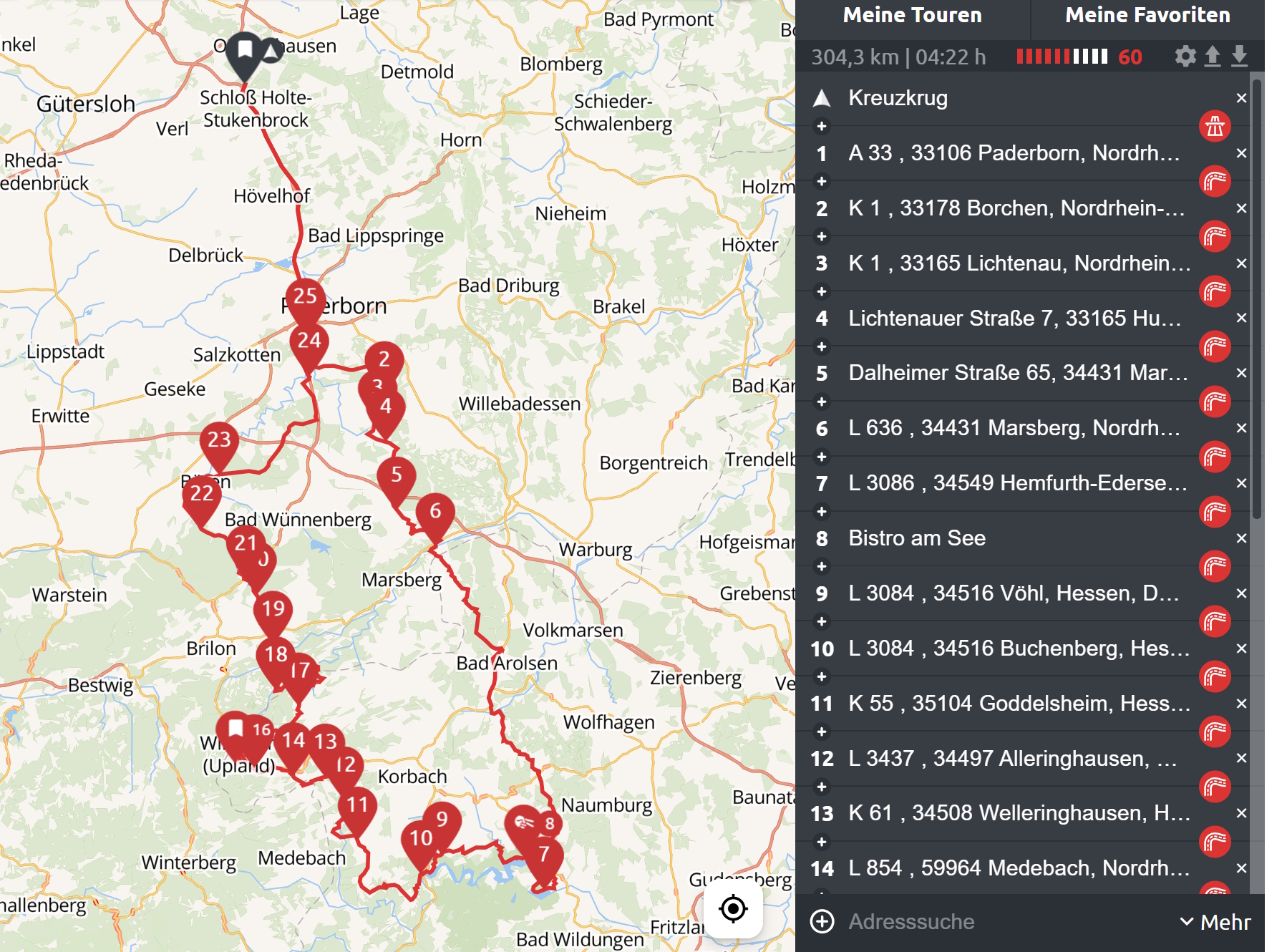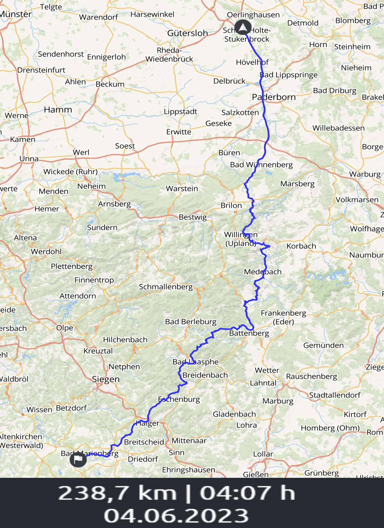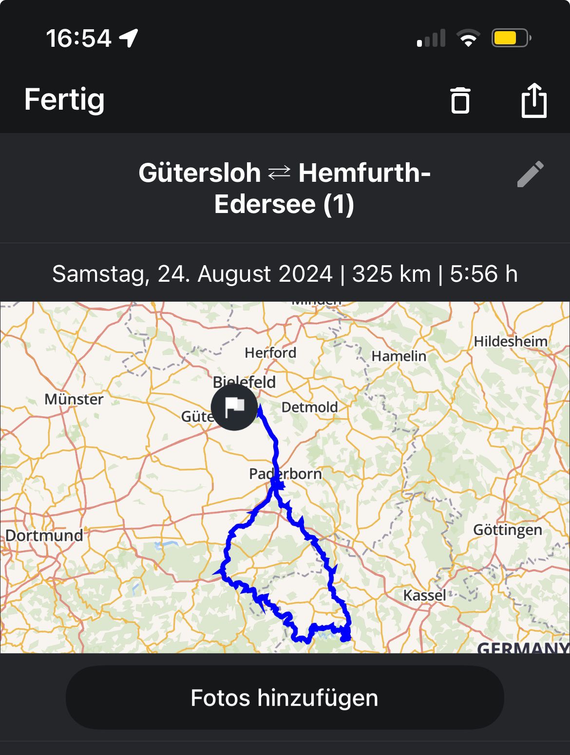 Tour zum Edersee. Gute 325 Kilometer von Bielefeld über Paderborn zum Edersee. Von dort über den Willingen wieder zurück.