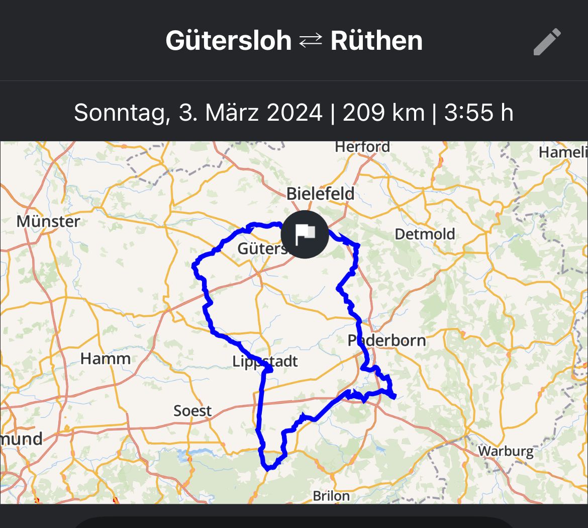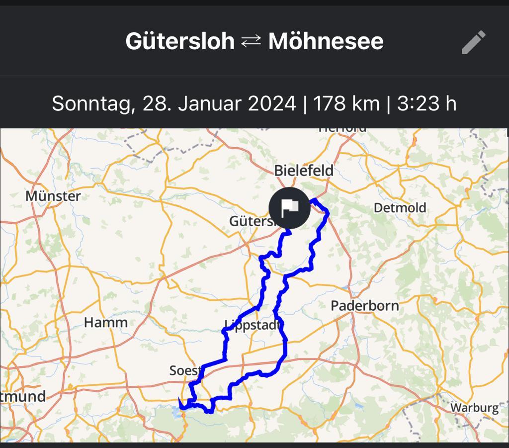 Die erste Tour 2024. Bei bestem Kaiserwetter und frischen 6 - 10 Grad ging es zu viert zum Möhnesee. Die Aufwärmpause im Geronimo ist nur zu empfehlen. Leckeres Essen und schönes Ambiente. Nach gut 180 KM sind alle wieder heil Zuhause angekommen. Gut das es warme Unterhosen gibt :).